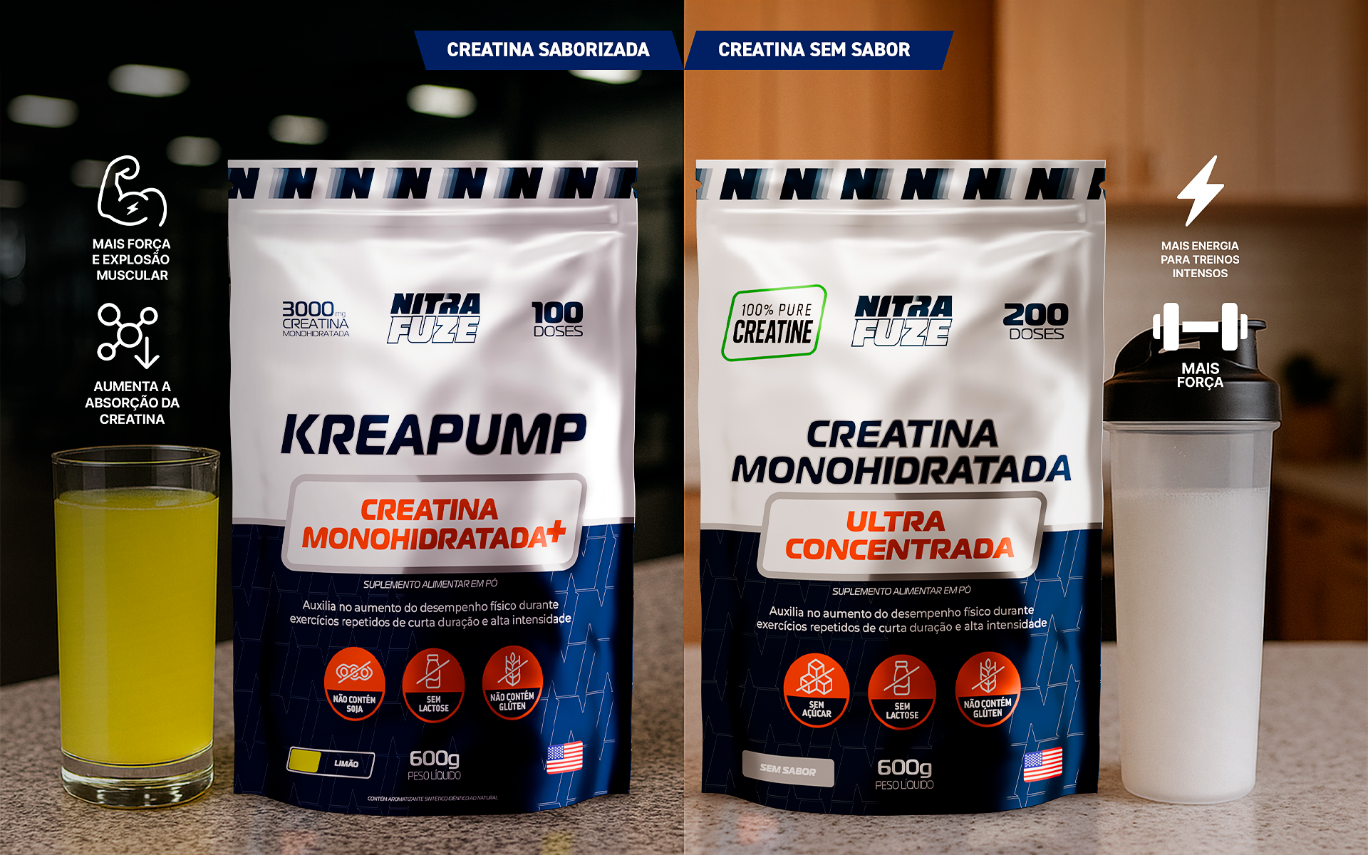 A KREAPUMP vai além. Sua fórmula com creatina monohidratada potencializa a absorção e o transporte de nutrientes, entregando mais força, pump e recuperação desde a primeira dose. Disponível com ou sem sabor, é performance sentida no treino.